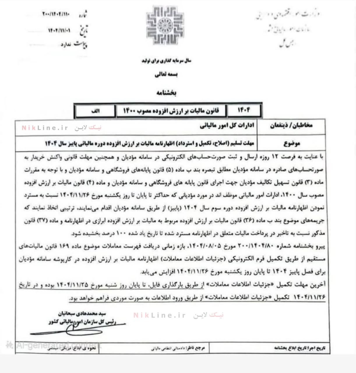 آخرین مهلت استرداد (ارسال و تایید نهایی) اظهارنامه مالیات بر ارزش افزوده پاییز ۱۴۰۴ تا ۲۶ بهمن ماه