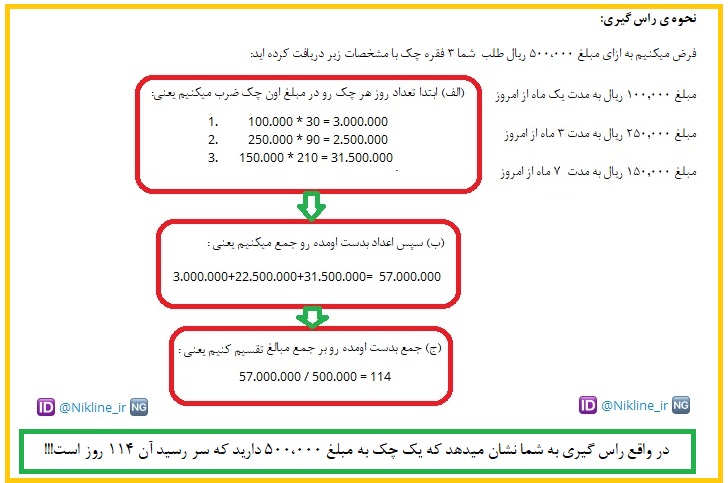عدد ۱۱۴ بدست آمده نشان دهنده ی این است که مدت راس چک شما ۱۱۴ روز است و چون ۱۱۴ روز از ۱۲۰ روز (چهارماه) کمتر است شما میتوانید این چک را از مشتری خود قبول کنید.