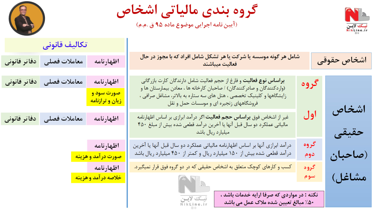 تبصره 2- در مواردی که مودیان صرفا به فعالیت ارایه خدمت اشتغال داشته باشند پنجاه درصد (50٪) نصاب های تعیین شده مبنای گروه بندی می باشد.