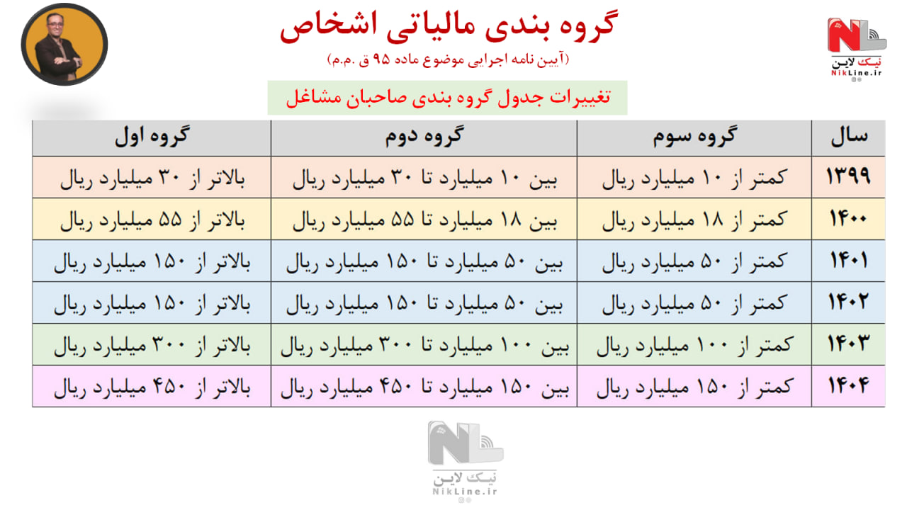 8- سایر صاحبان مشاغل و حرفی که درآمد ابرازی (فروش کالا یا فروش توام کالا و ارایه خدمت) بر اساس اظهارنامه مالیاتی عملکرد دو سال قبل (اظهارنامه تسلیمی خردادماه هر سال مبنای تعیین گروه بندی سال بعد از تنظیم اظهارنامه عملکرد است. به عنوان مثال مبلغ فروش و سایر درآمدهای مندرج در اظهارنامه مالیاتی عملکرد سال 1402 مبنای گروه بندی سال 1404 می باشد) یا آخرین درآمد قطعی شده (فروش کالا یا فروش توام کالا و ارایه خدمت) آن ها بیش از مبلغ چهارصد و پنجاه میلیارد ریال باشد (مشروط به ابلاغ برگ قطعی حداکثر تا پایان دی ماه سال قبل به شخص مودی یا نماینده قانونی وی).